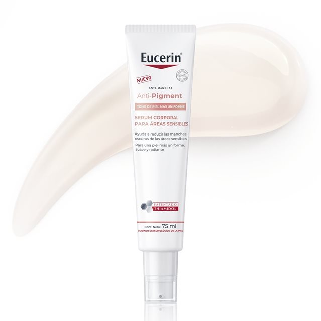El sérum corporal Eucerin Anti-Pigment para áreas sensibles combina potentes ingredientes activos que actúan de diferentes maneras para reducir la hiperpigmentación y crear un tono de piel más uniforme y homogéneo, al tiempo que calma la piel sensible.