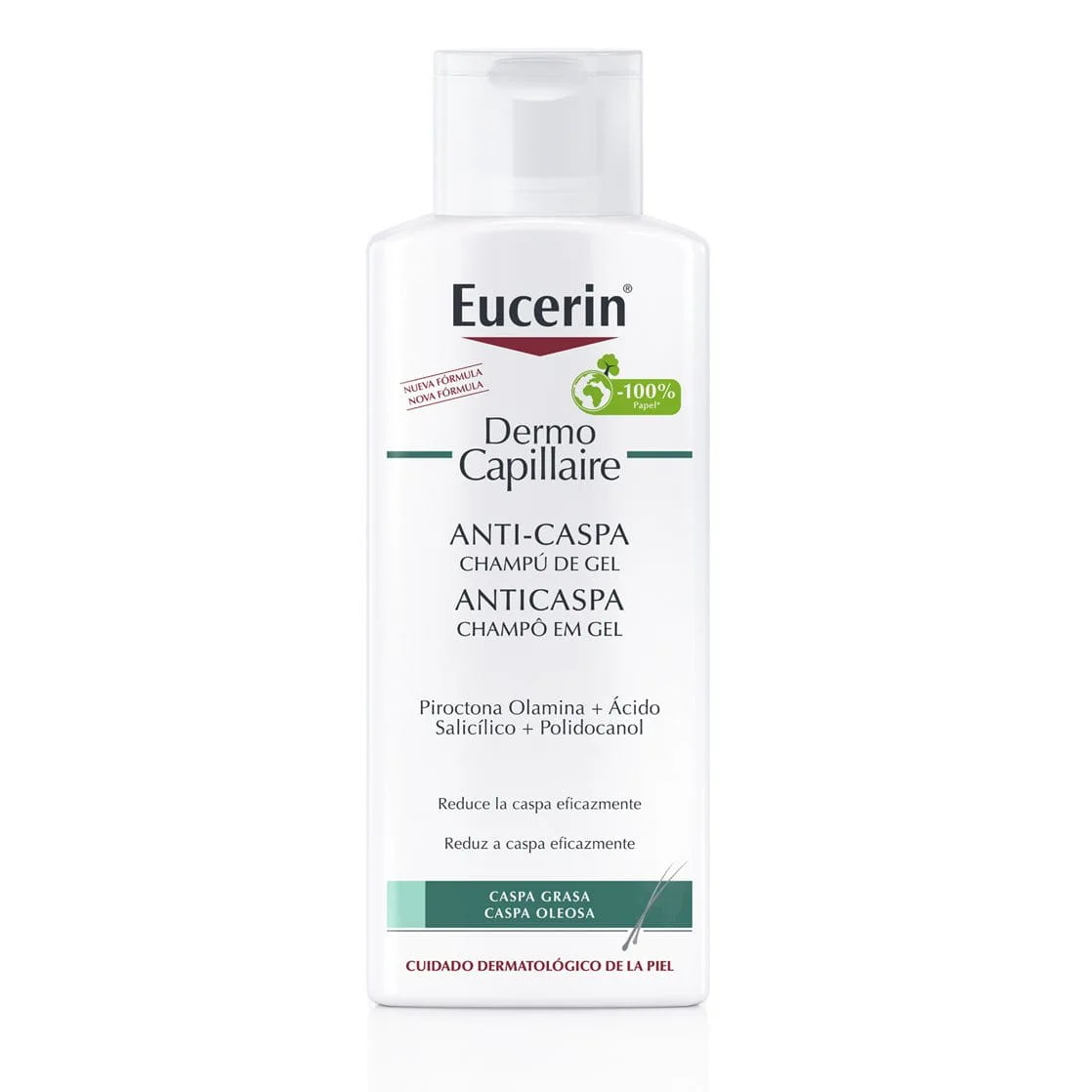 Eucerin DermoCapillaire CHAMPÚ ANTICASPA está diseñado específicamente para la caspa grasa y para la dermatitis seborreica. Limpia con suavidad su cuero cabelludo y su pelo eliminando las escamas amarillas y pegajosas a la vez que reduce de manera efectiva la caspa grasa y la mantiene bajo control. Su suave fórmula calma el cuero cabelludo y reduce el picor desde el primer lavado, en tanto que sus agentes de acondicionamiento especial le dan un pelo de brillo sano y una sensación de suavidad.