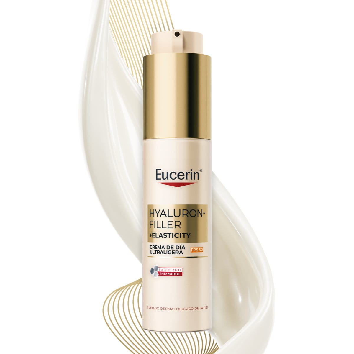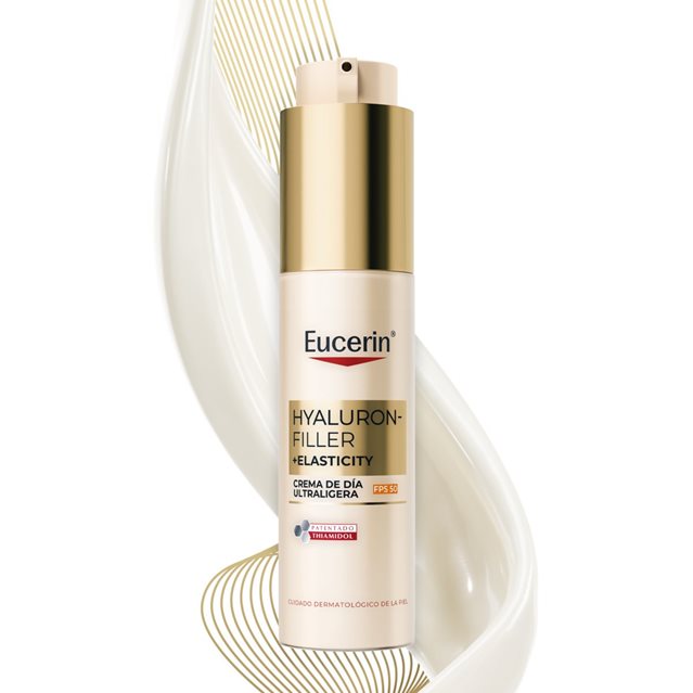 Anti-aging day fluid for skin that shows premature signs of aging. Eucerin Hyaluron-Filler + Elasticity Ultra-light Day SPF 50 is an anti-aging day fluid that improves skin’s elasticity and corrects all types of dark spots*. The unique formula delivers multiple anti-aging benefits. The Collagen-Elastin Complex, a powerful combination of Hyaluronic Acid and Creatine, re-energizes collagen production and increases skin’s elasticity. Eucerin’s patented Thiamidol reduces the appearance of dark spots and their reapparition. For skin that is smoother, more radiant, and visibly younger looking. The ultra-light day fluid also contains an imperceptible SPF 50 and a UVA filter to effectively prevent UV-induced premature skin aging and deepening of wrinkles.